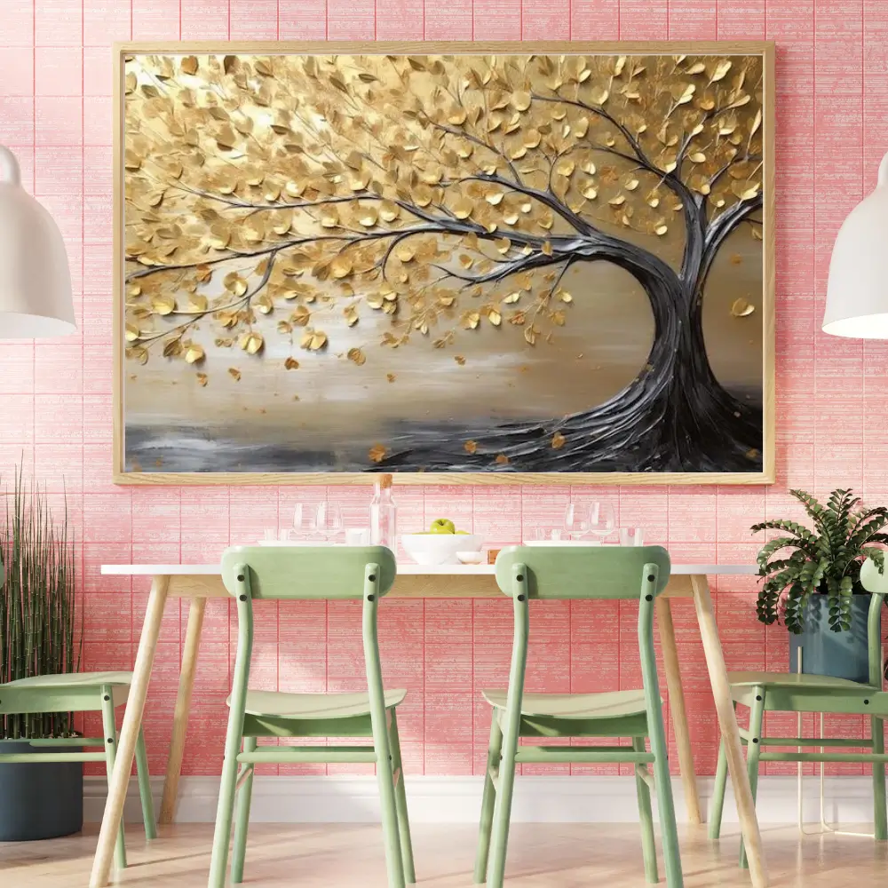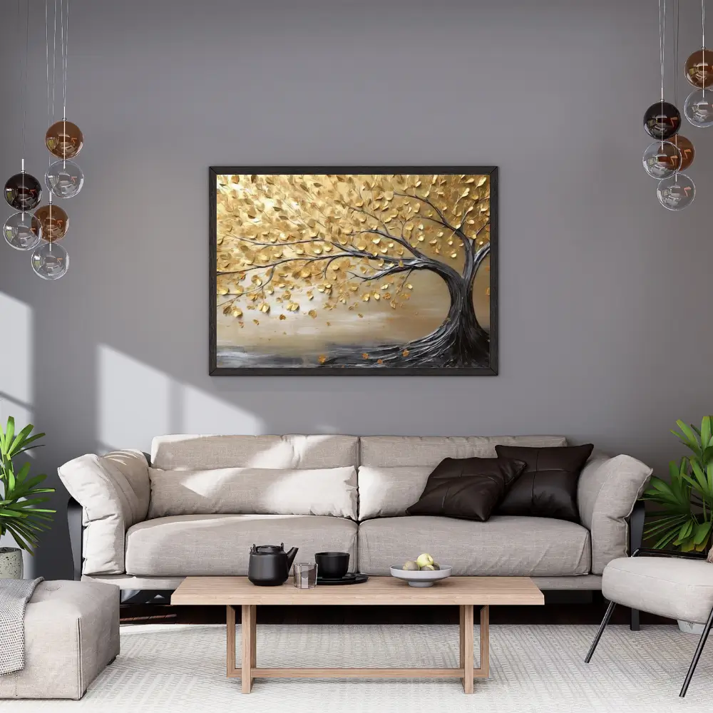This piece portrays the Tree of Life in a refined and luxurious style. A bold, dark trunk anchors the composition, while its branches stretch gracefully across the canvas, adorned with golden and beige leaves that shimmer like scattered light. The soft, neutral-toned background enhances the tree’s elegance, creating a serene and balanced atmosphere.The artwork evokes a sense of inner richness and timeless calm — a visual meditation on rootedness, growth, and the quiet beauty of endurance.