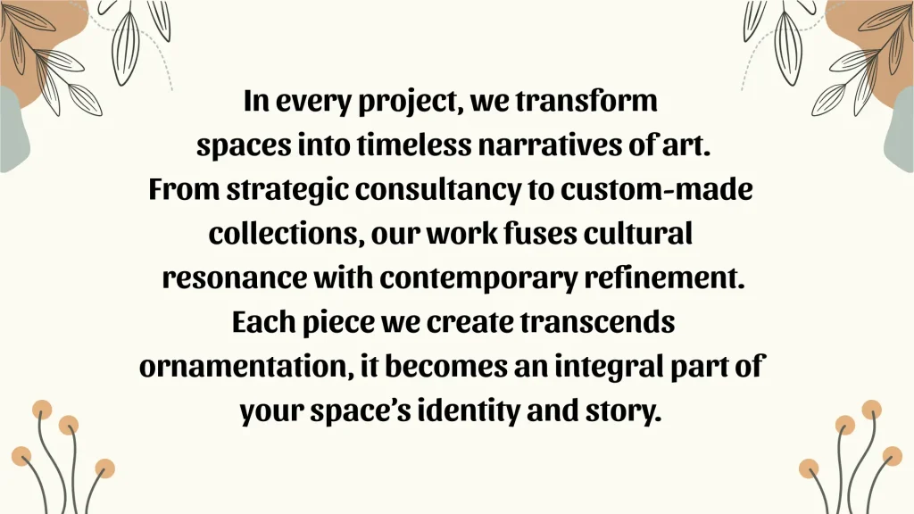 We arrange and install artworks to become a living part of the space, embodying your vision in a complete visual experience.